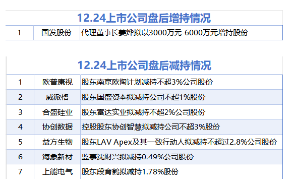 【12月24日增减持汇总】据统计,12月24日,截至发稿,国发股份披露增持情况。包括欧普康视、威派格、合盛硅业、协创数据、益方生物、海象新材、上能电气在内的7家A股上市公司披露减持情况。